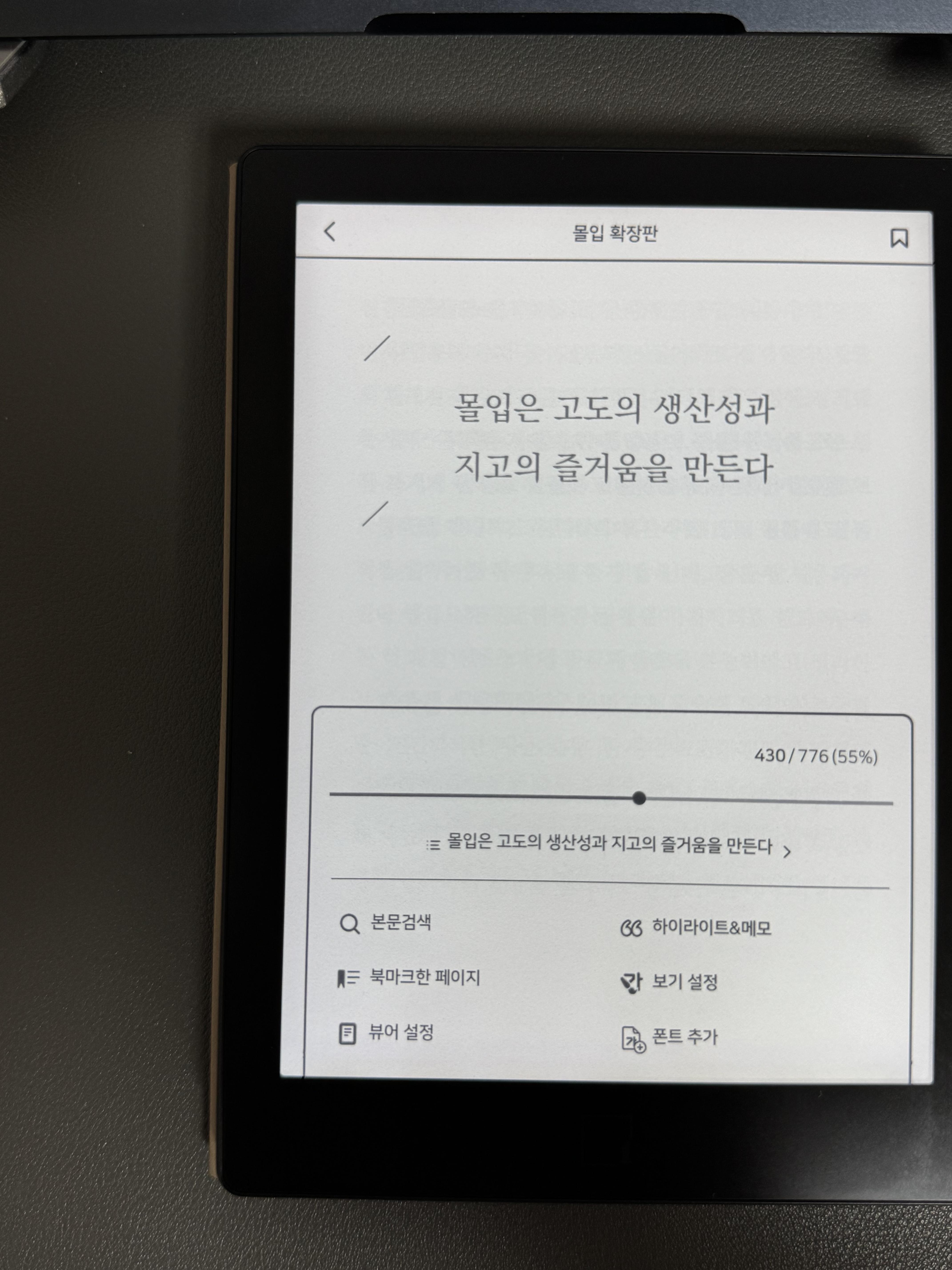 이번에 사용하면서 느낀 이북리더기의 장점도 있는데, 철저히 독서를 위해 만들어진 기기다 보니 오랫동안 사용해도 눈의 피로도가 덜하다는 것이다. 컬러 액정이 아니기도 하고, 은은한 액정 화면과 조명이 왠지 종이책 느낌도 살짝 난다.
