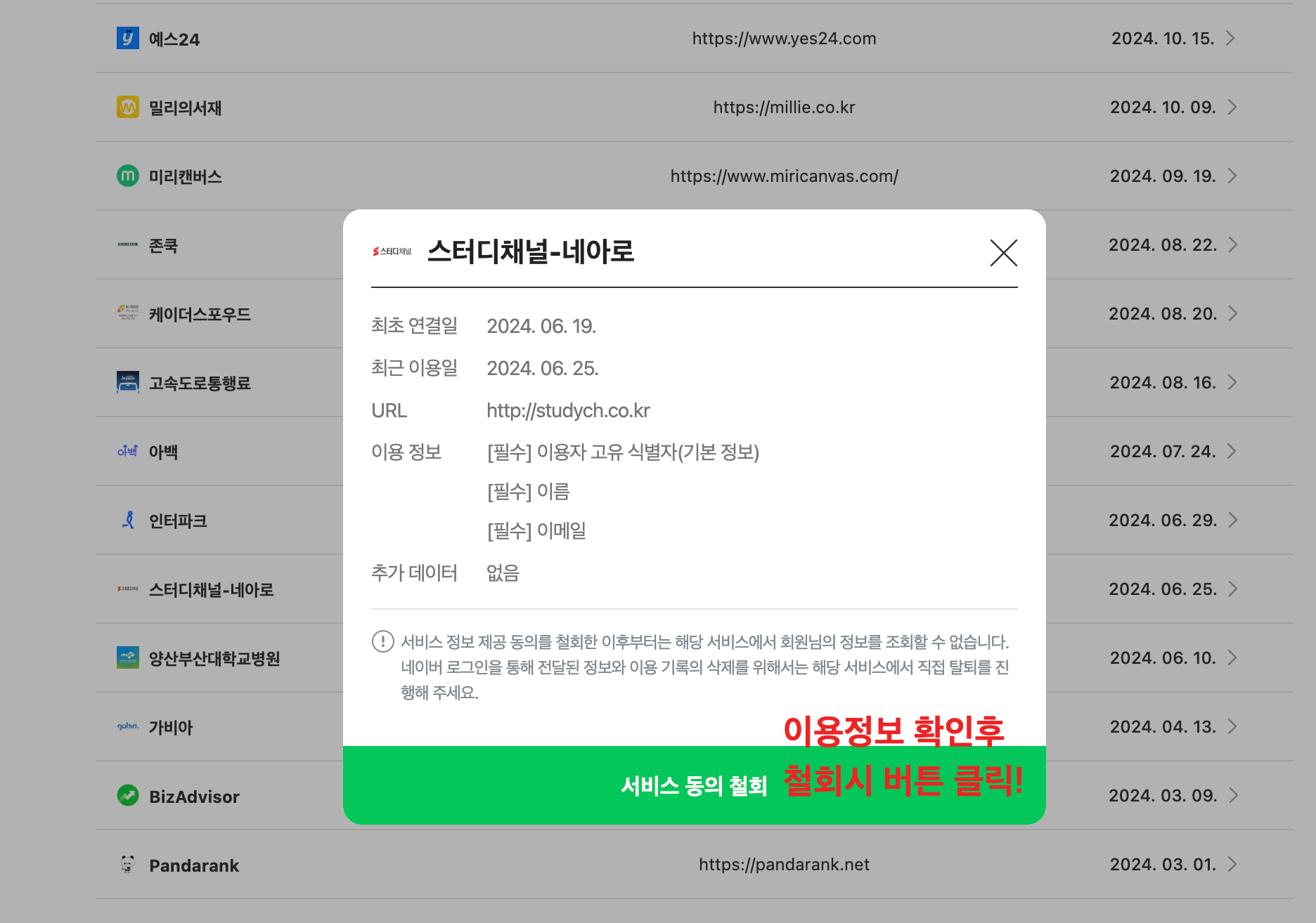 4) 어떤 정보가 이용되는지 확인 후, 불필요할 경우 <서비스 동의 철회> 선택하기