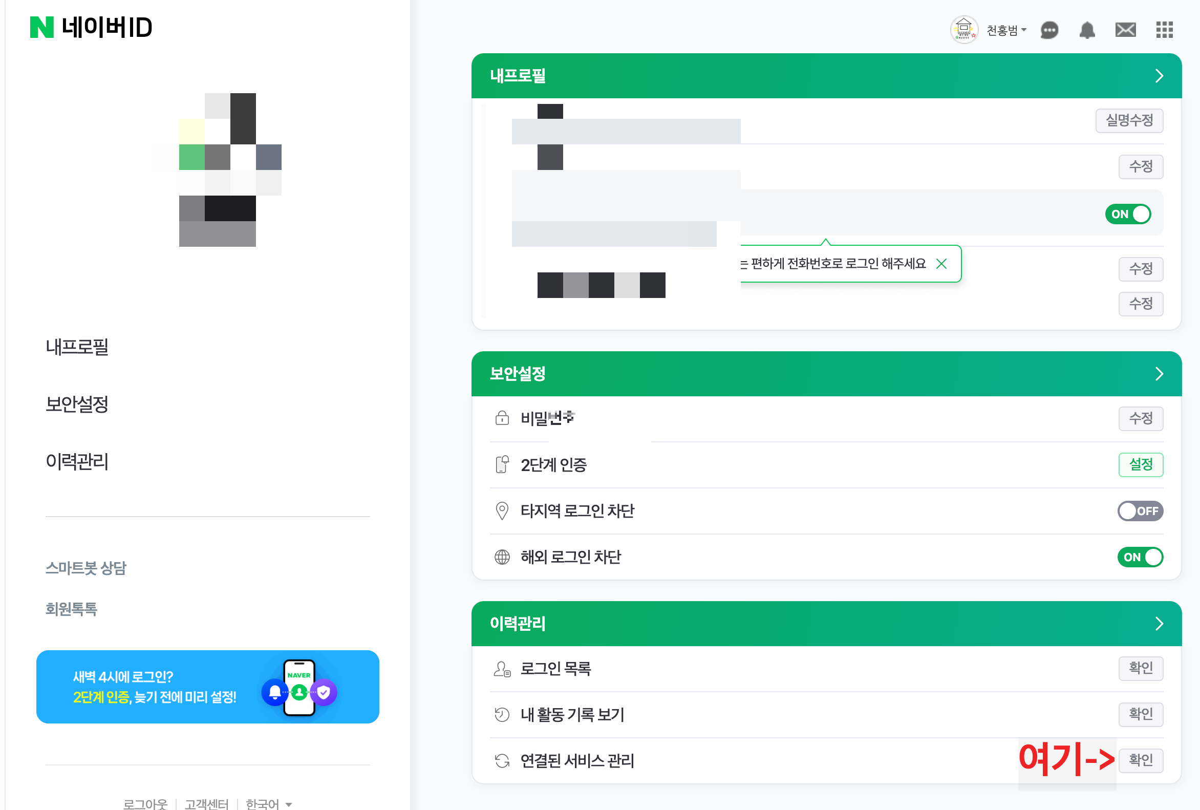 2) 화면에 들어가면 우측메뉴 하단 <연결된 서비스 관리>로 접속