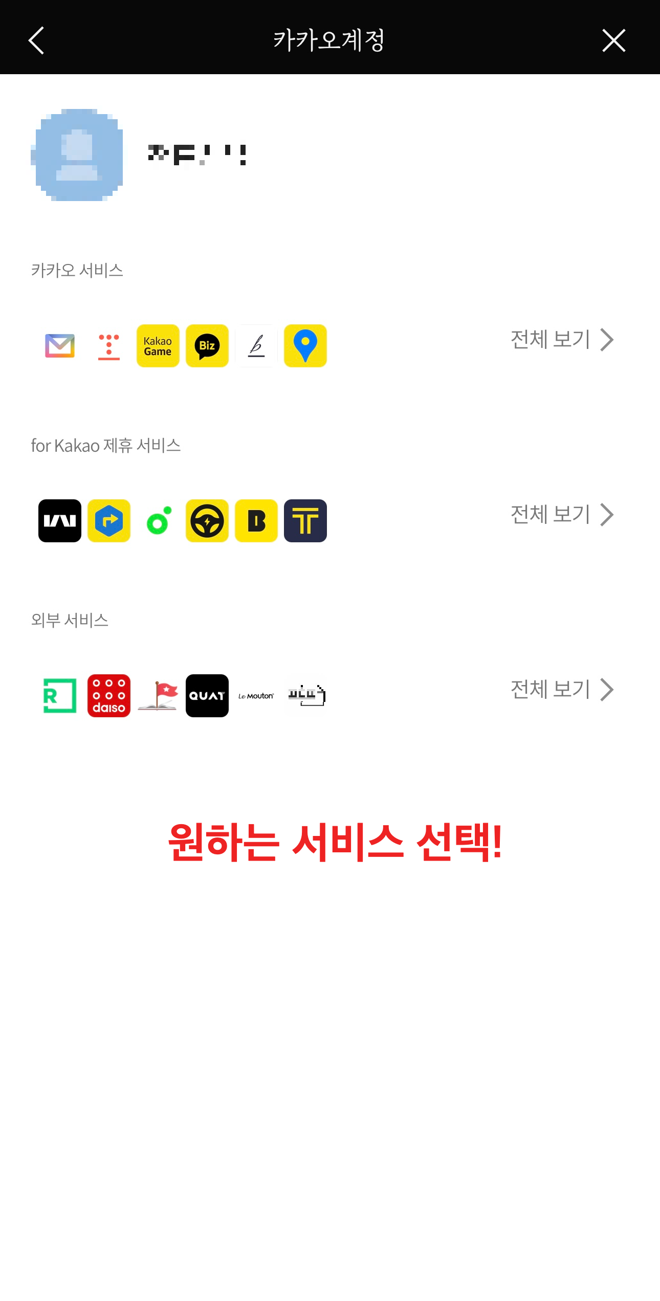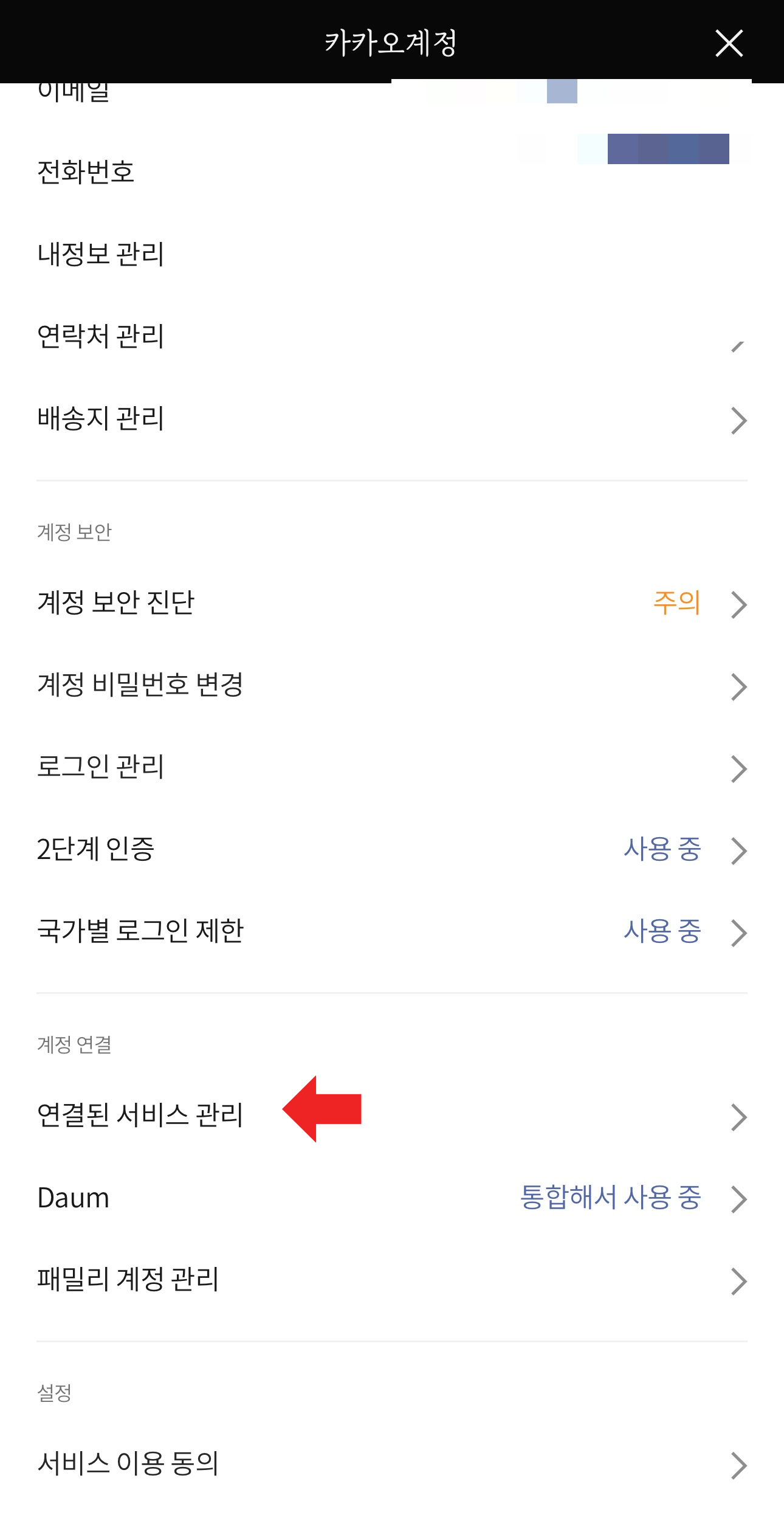 2) 카카오계정 메뉴 하단 <연결된 서비스 관리> 접속 -> 가입된 서비스 확인후 서비스 전체보기 접속