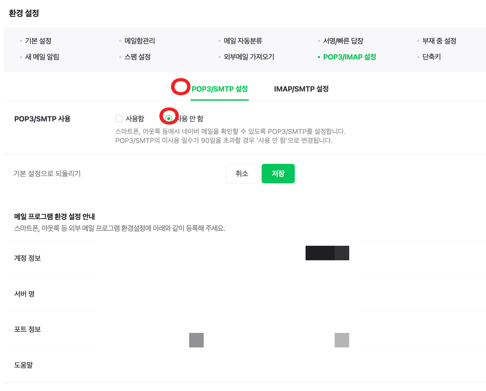 2) POP3/SMPT 설정 → 사용 안 함 후 저장 → IMAP/SMPT 설정 → 사용 안 함 후 저장