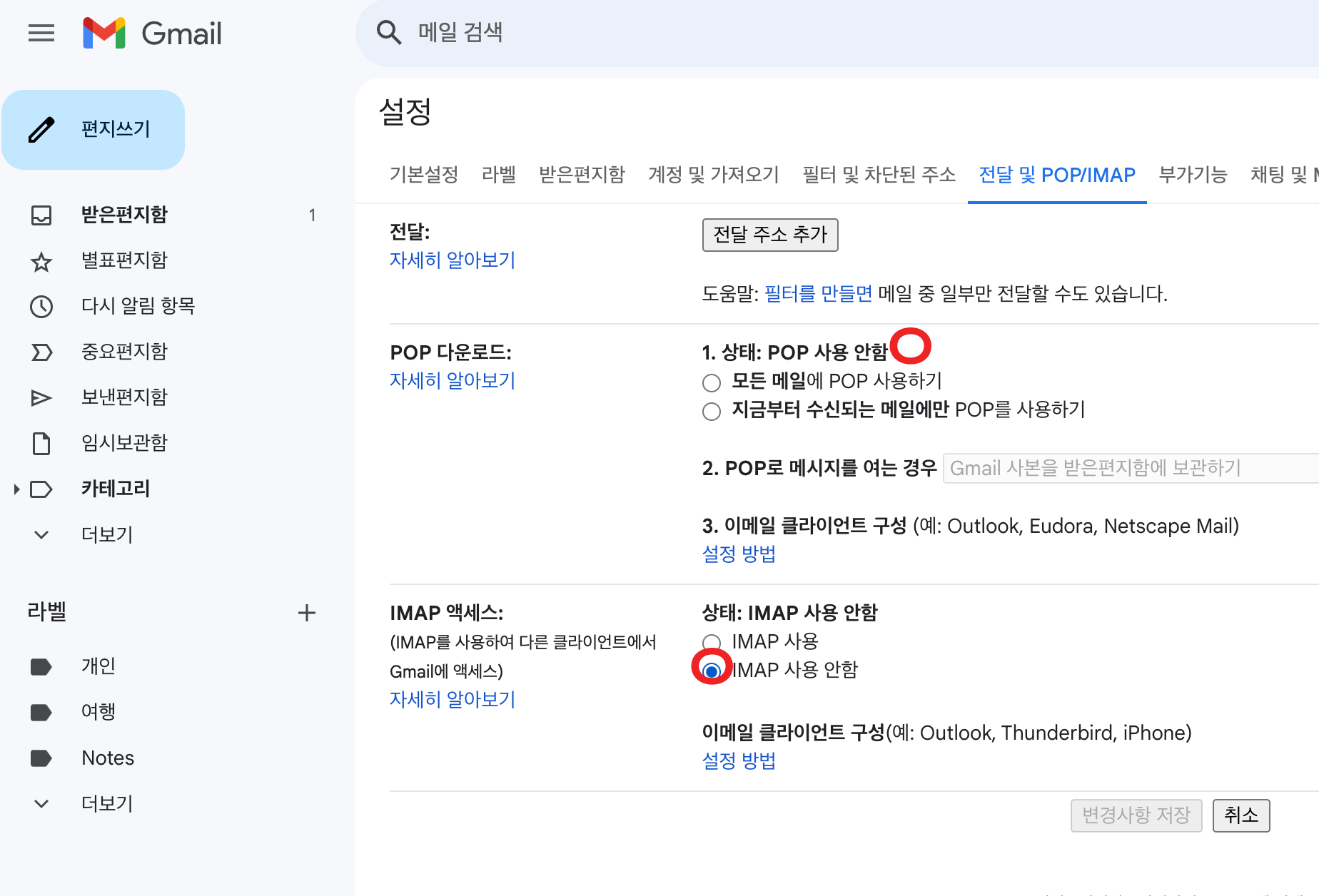 2) 전달 및 POP / IMAP → POP 다운로드, IMAP 액세스 모두 사용 안 함으로 설정!