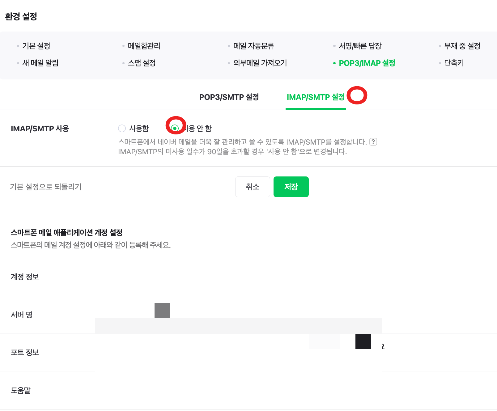 2) POP3/SMPT 설정 → 사용 안 함 후 저장 → IMAP/SMPT 설정 → 사용 안 함 후 저장