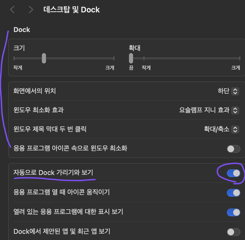 2) 시스템 설정 메뉴의 데스크톱 및 Dock 클릭 -> 우측 설정 메뉴에서 Dock 효과와 자동으로 가리기 설정 또는 해제
