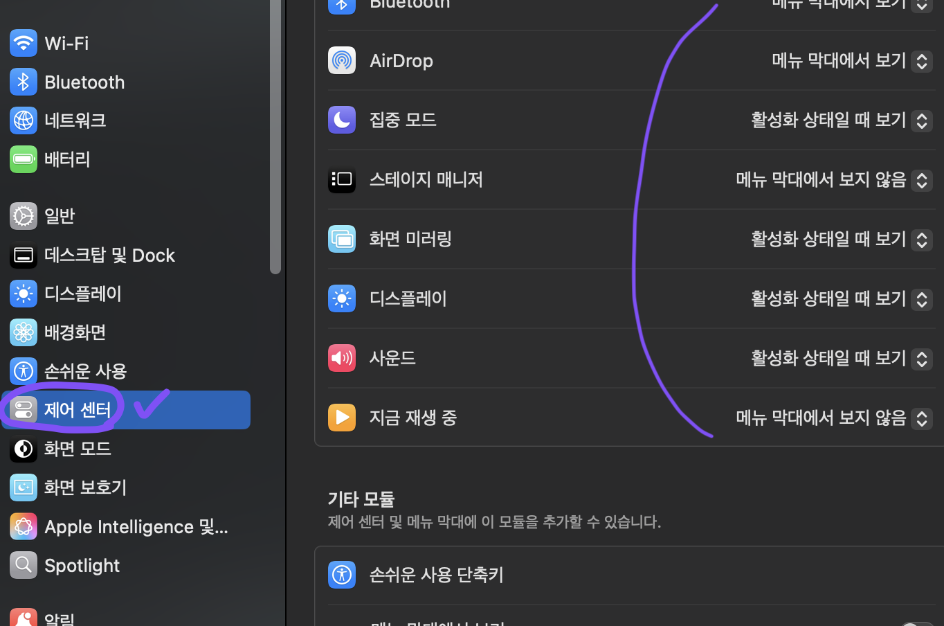 2) 시스템 설정메뉴에서 제어센터 메뉴클릭 -> 활성화 세팅 또는 해제 항목 설정 (배터리 잔량 표시는 아래로 내리면 있음!)