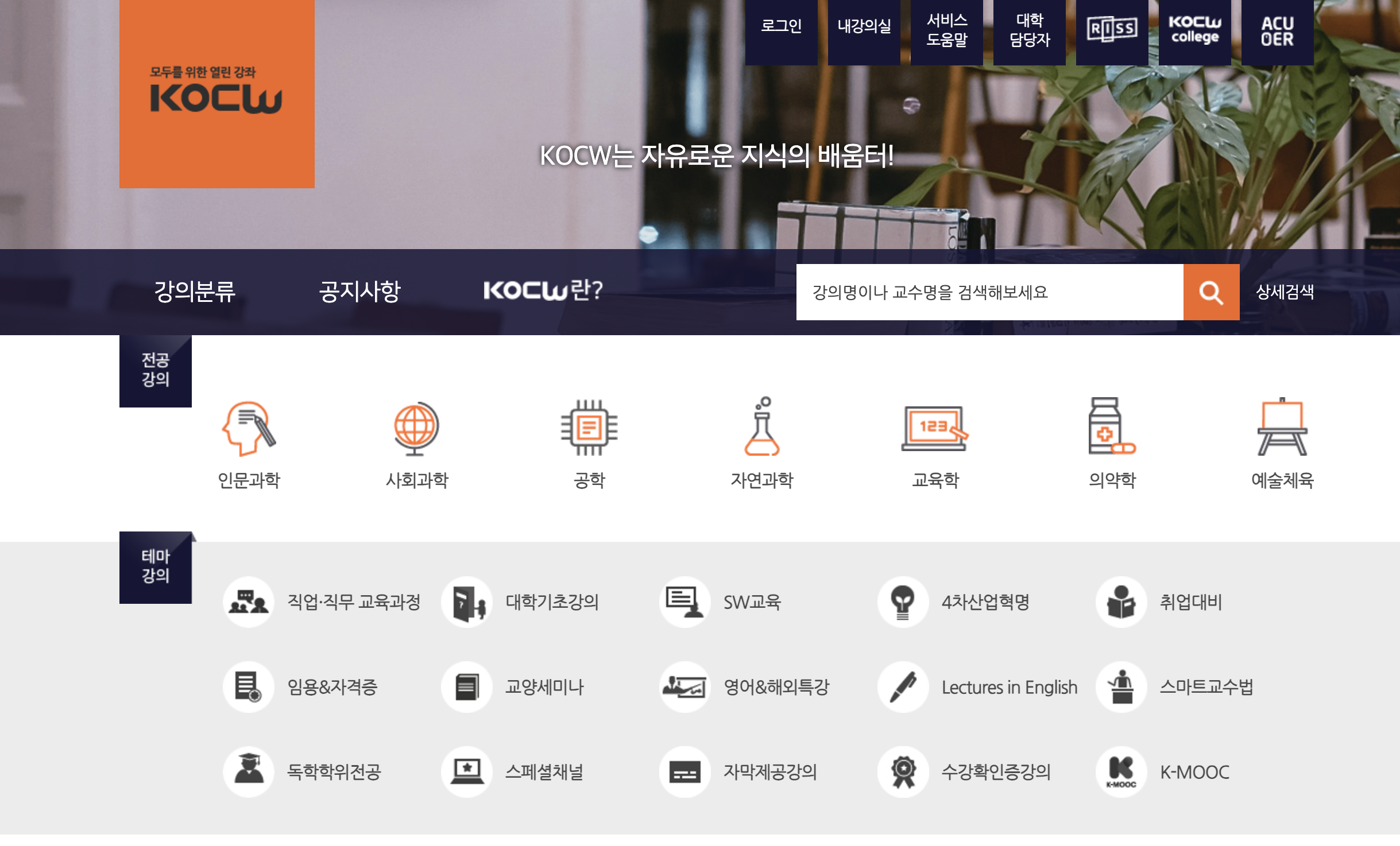 고등교육 교수학습자료 공동활용 체제라고 불리는 KOCW는 국내, 외 대학 및 기관에서 자발적으로 공개한 강의 영상, 자료를 무료로 제공하는 서비스로 대학생, 교수 및 배움을 원하는 누구나 이용가능한 플랫폼이다.