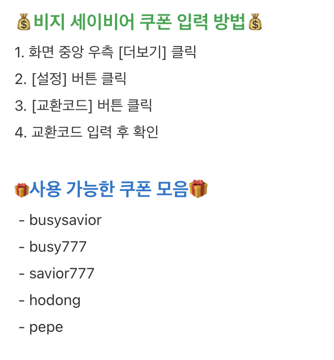 비지 세이비어 최신 쿠폰 교환 코드 (12/19 15:00 기준)