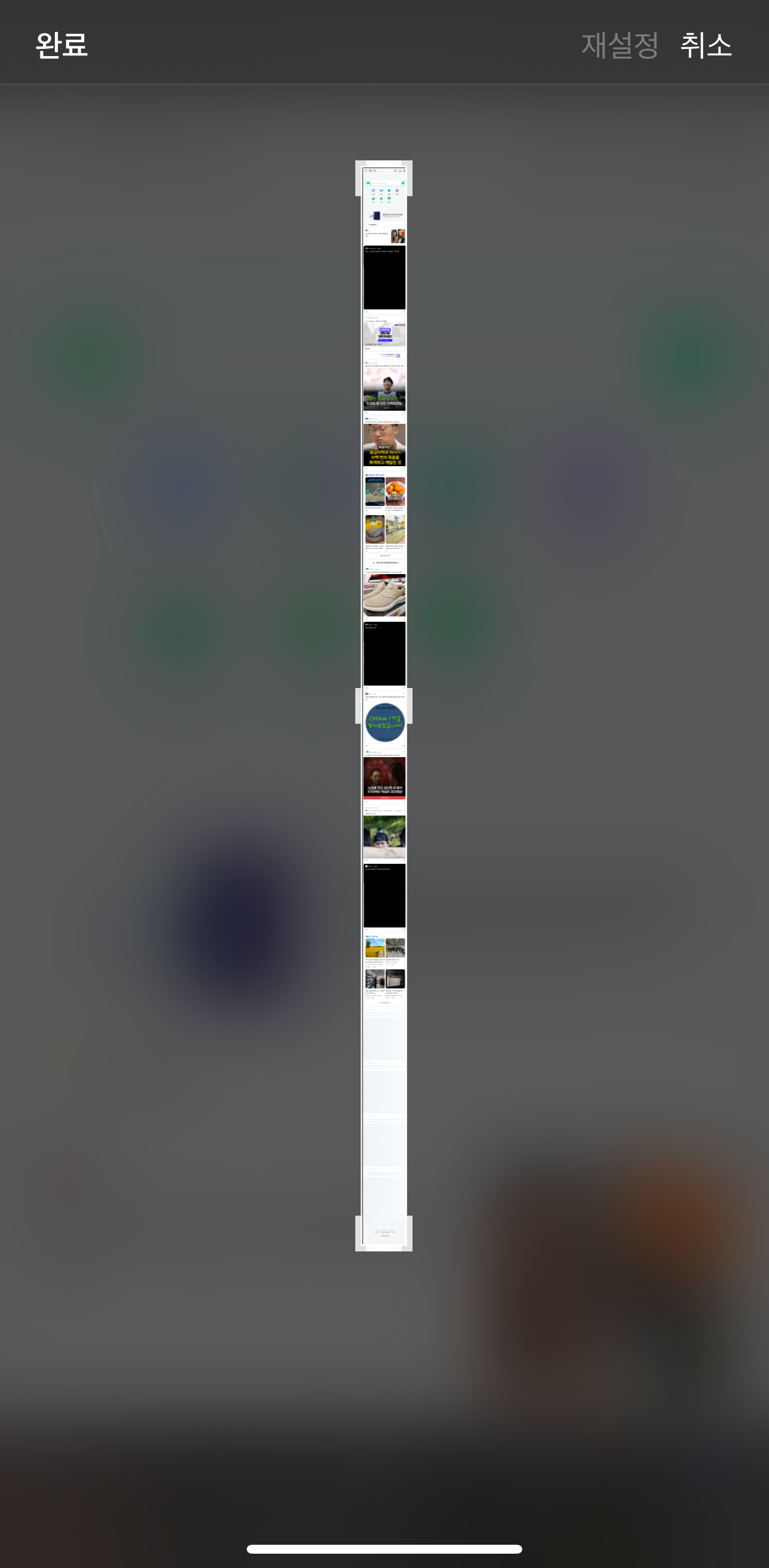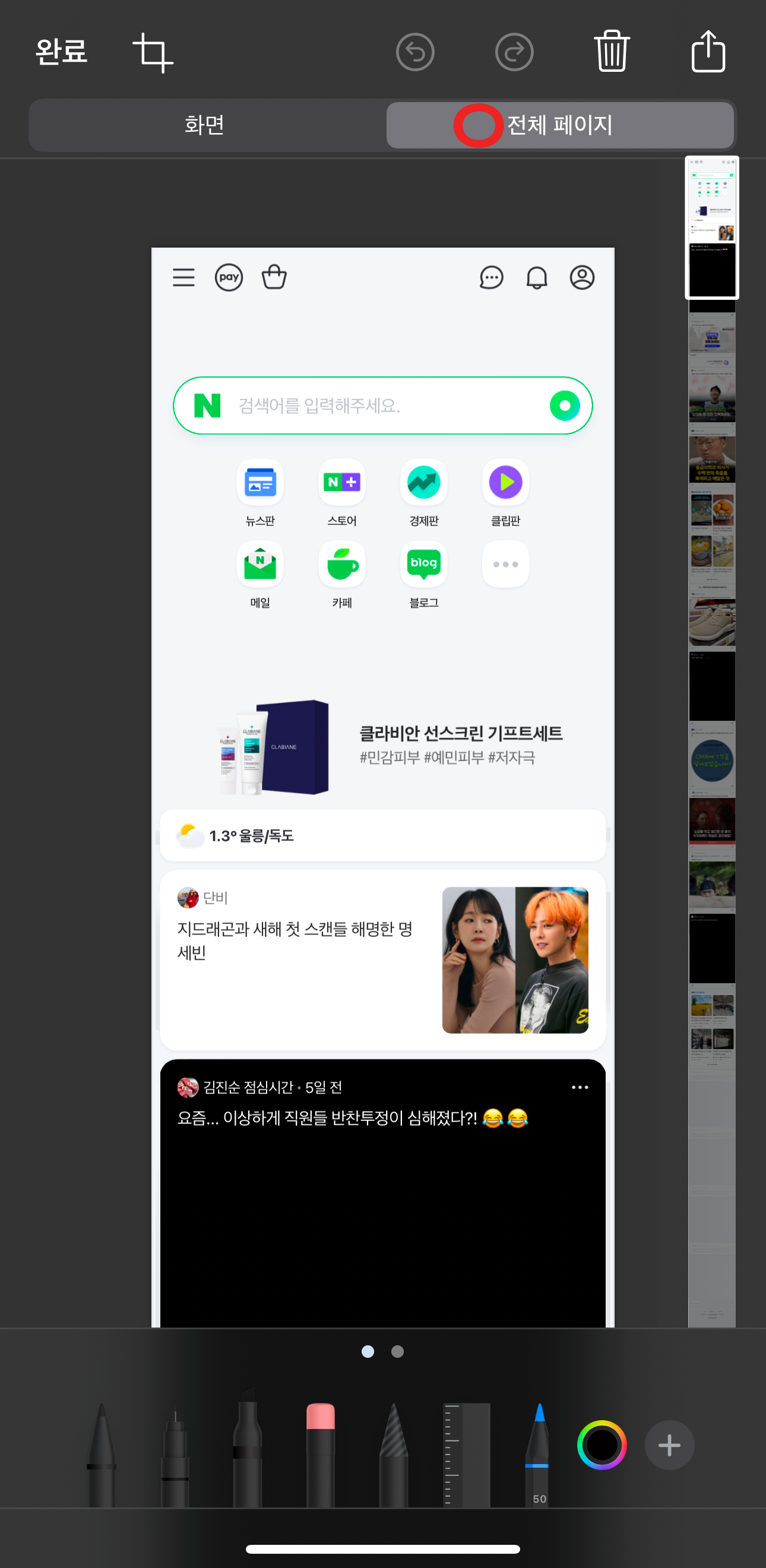 2) 터치 후 사진편집기능에서 우측 상단 '전체 페이지' 선택 → 필요한 부분을 선택하거나 저장하면 스크롤 캡쳐 완료