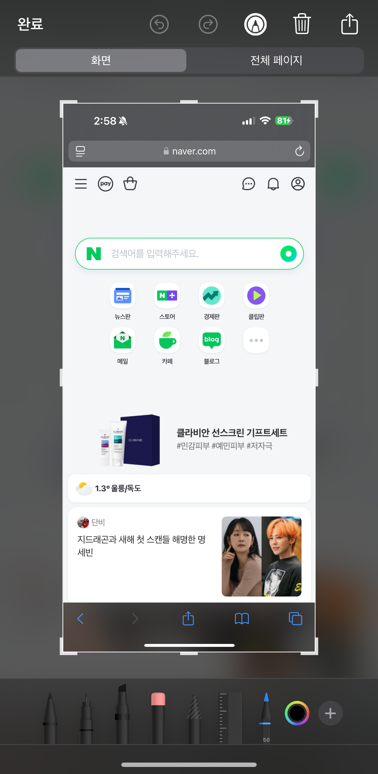 1) 사파리 앱에서 스크롤 화면을 위의 방식에 맞춰 캡쳐한다. → 좌측 하단 생성된 이미지를 터치 한다.
