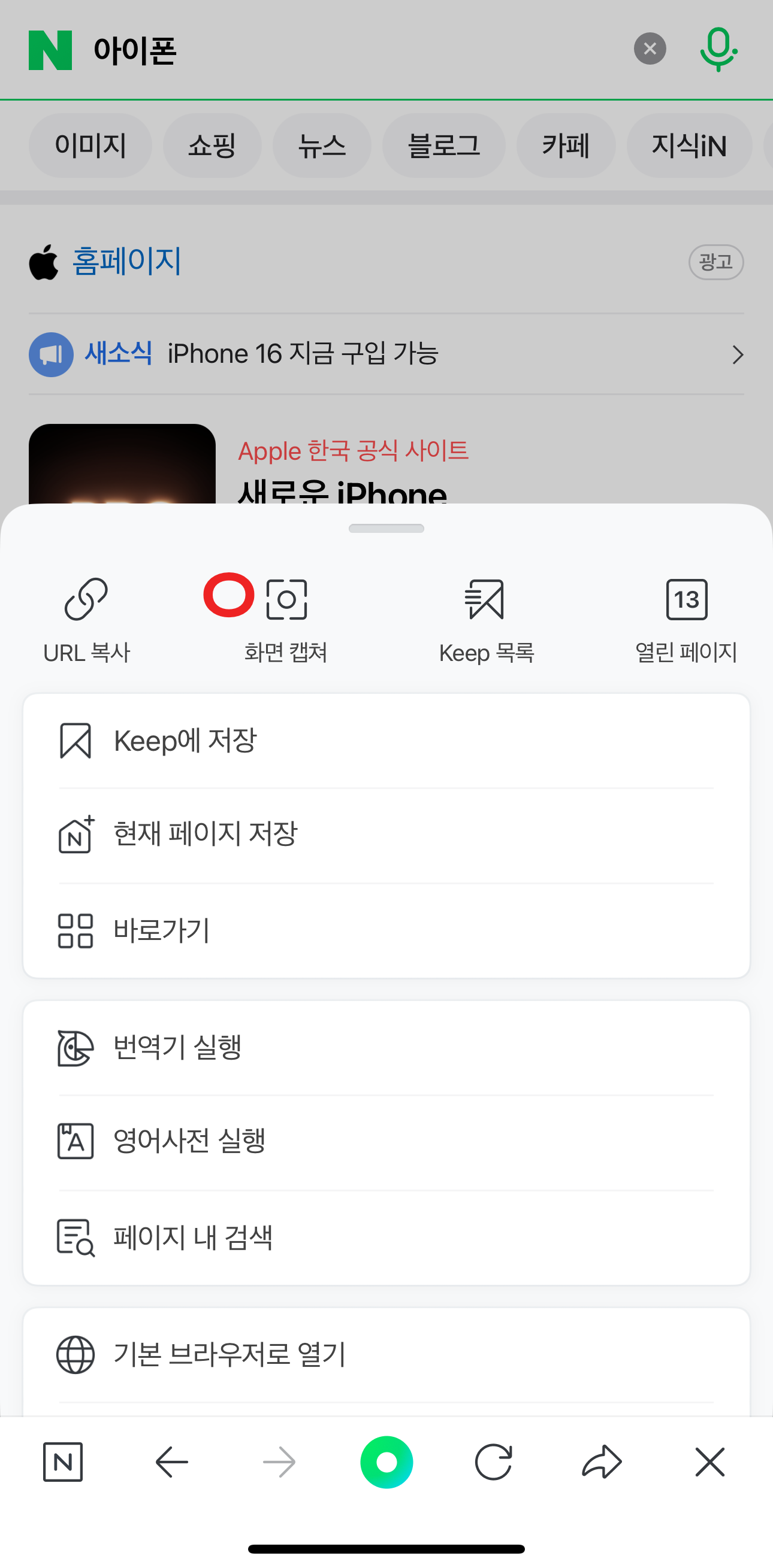 1) 네이버 앱에 접속 우측하단 두줄 버튼 선택 →항목 내 '화면 캡쳐' 선택