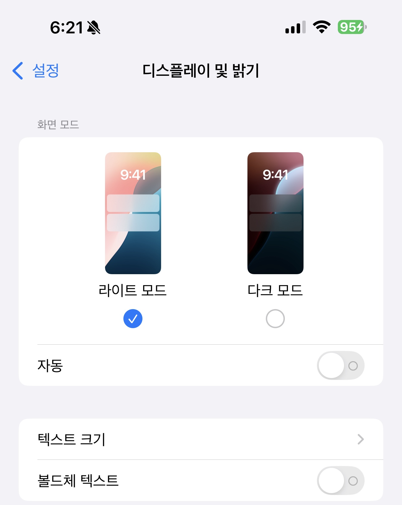 1) 설정 → 디스플레이 및 밝기 → 라이트 모드 & 다크 모드 선택