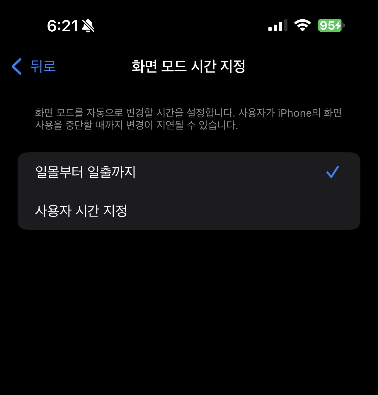 2) 설정 → 디스플레이 및 밝기 → 라이트 모드 & 다크 모드 선택 → 자동 → 옵션 → 일몰부터 일출까지 또는 사용자 시간지정