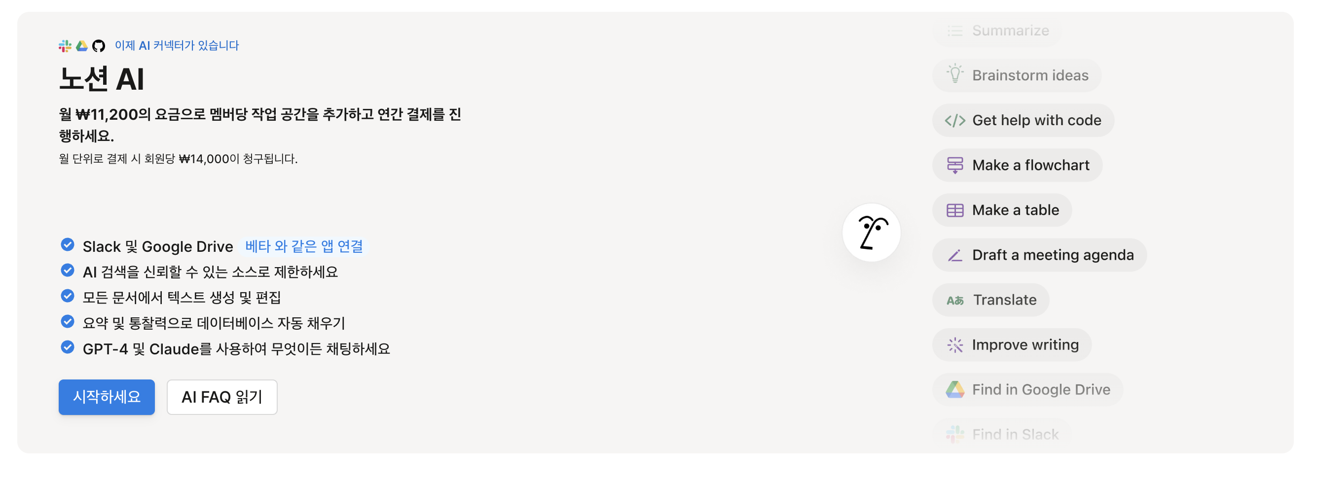 그리고 노션 AI 요금제도 별도로 있는데, 기본 플랜에서 해당 금액만큼 추가해서 사용할 수 있다. 사용하면 유용하긴 하지만, 다른 AI 서비스들이 워낙 잘되어있어서 꼭 필수라고 하기엔 조금 애매하긴 하다.