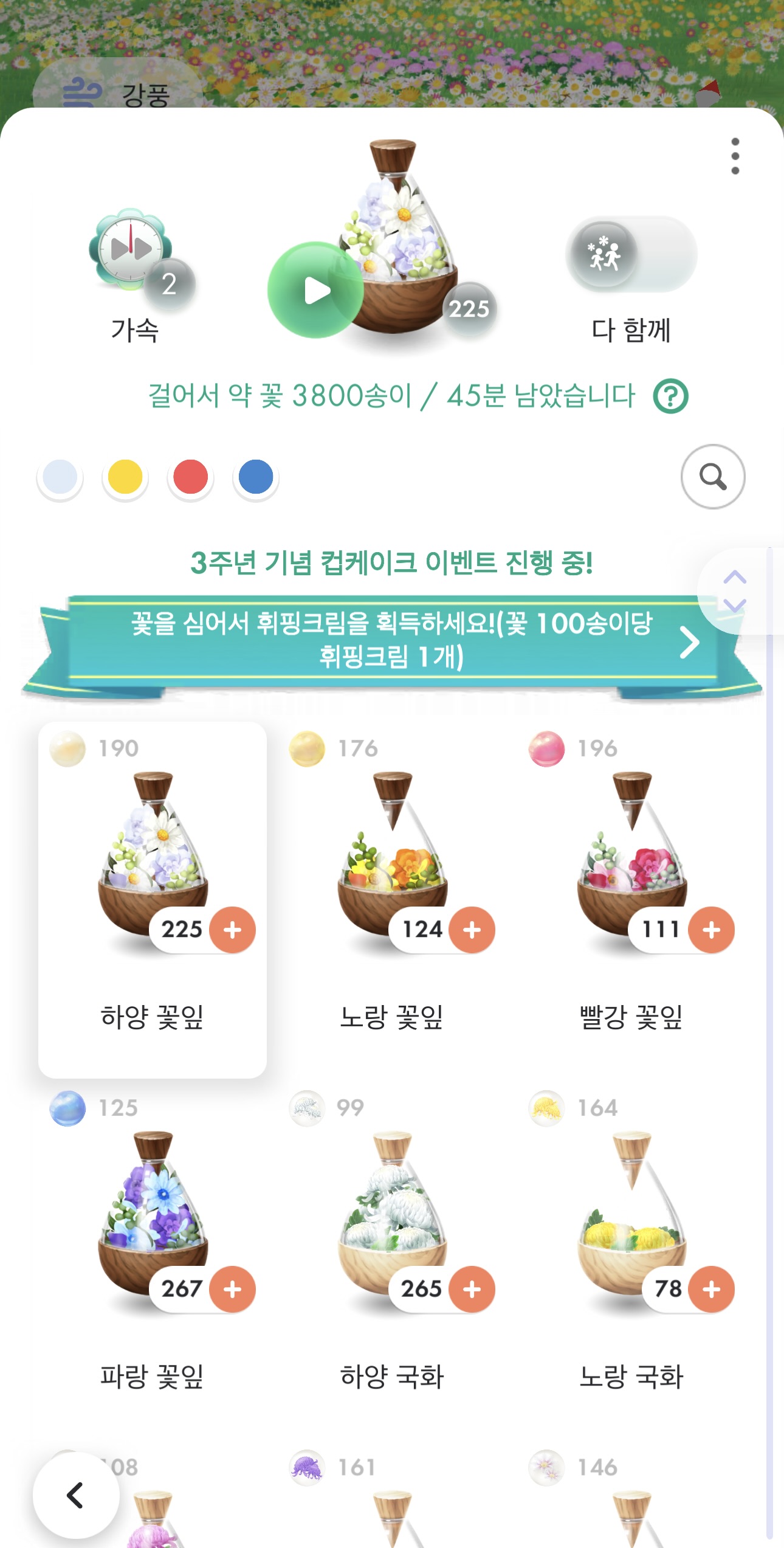 - 처음에는 꽃도 부족하고 모종도 없기에 할 수 있는 것이 많지 않다. 그래서 중요한 것은 다소 재미가 없더라도 운동삼아 많이 걸으며 꾸준히 레벨업을 해주는 것이 중요하다. 그러면서 꽃이나 모종을 아낌없이 피우고 사용해 최소 20 레벨 까지는 들어가야 조금은 넉넉한 자원으로 플레이할 수 있다.
