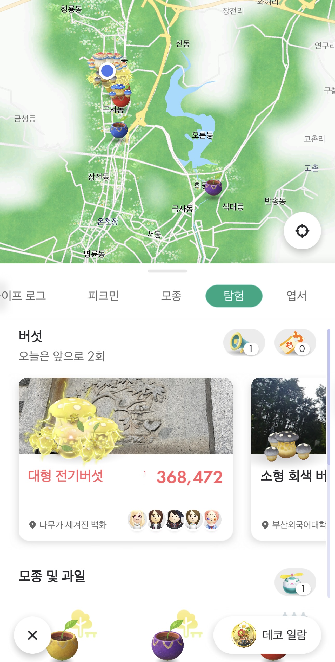 - 꽃잎의 경우 놓치는 사람들이 많은데 지도를 켜고 걷다 보면 꽃이 피는 순간 꽃에서 은은한 아우라가 생겨있는 것들이 있다. 그 꽃잎을 아래로 스와이프 하면 꽃잎이 몇 개씩 떨어지는데 이것도 은근히 쏠쏠하다.