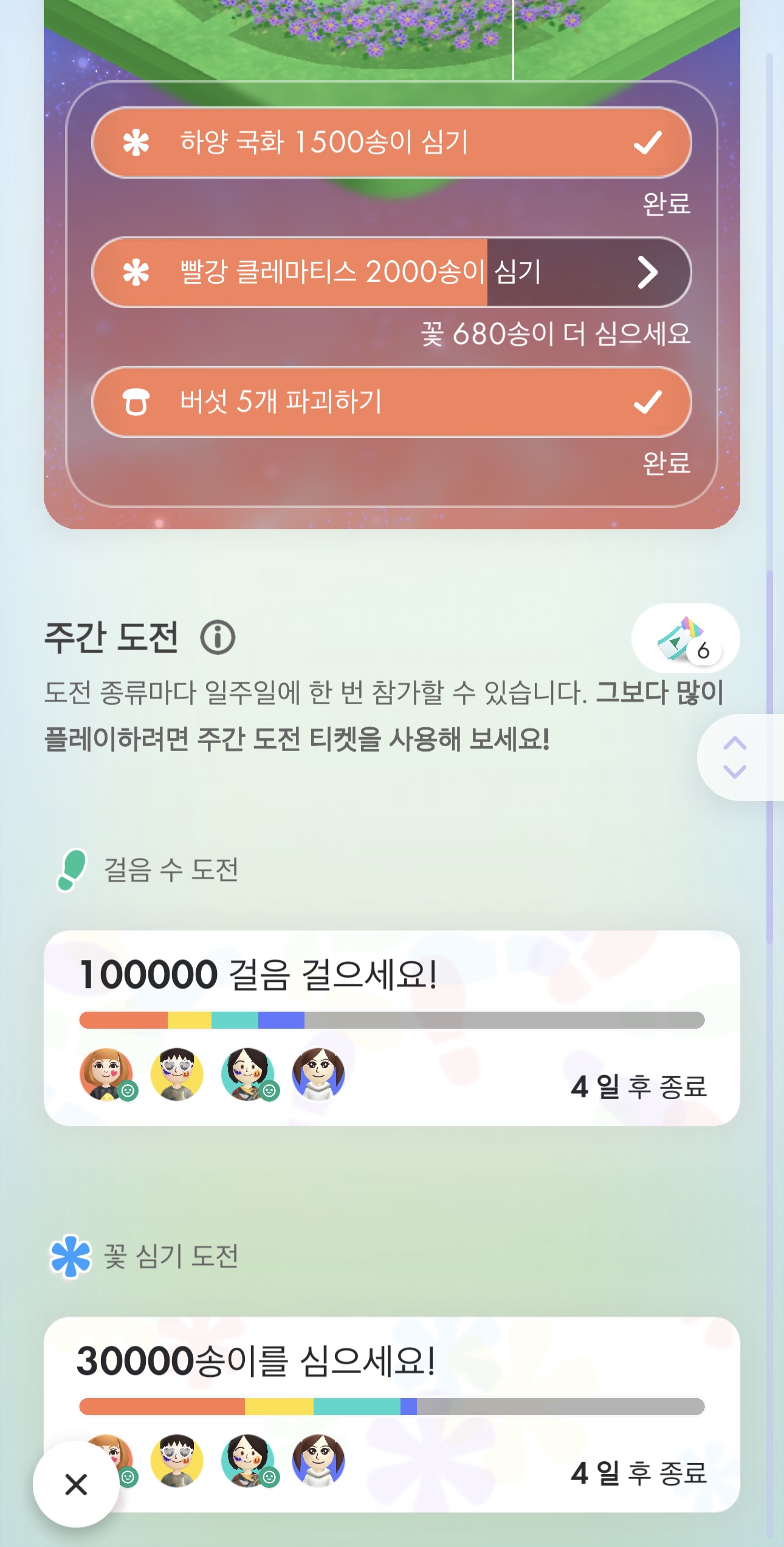 - 처음에는 꽃도 부족하고 모종도 없기에 할 수 있는 것이 많지 않다. 그래서 중요한 것은 다소 재미가 없더라도 운동삼아 많이 걸으며 꾸준히 레벨업을 해주는 것이 중요하다. 그러면서 꽃이나 모종을 아낌없이 피우고 사용해 최소 20 레벨 까지는 들어가야 조금은 넉넉한 자원으로 플레이할 수 있다.