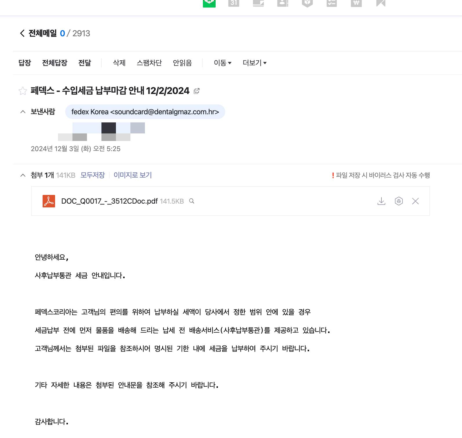근데 뭐 밑도 끝도 없이 첨부파일이 있고, 사후납부통관 세금 안내를 한다고 한다. 그래서 내용을 살펴보니 뭔 서비스를 제공해 준다고 하면서 세금을 내라고 글자체가 횡설수설하는 것 같기에, 습관적으로 첨부파일을 누르려 했다.