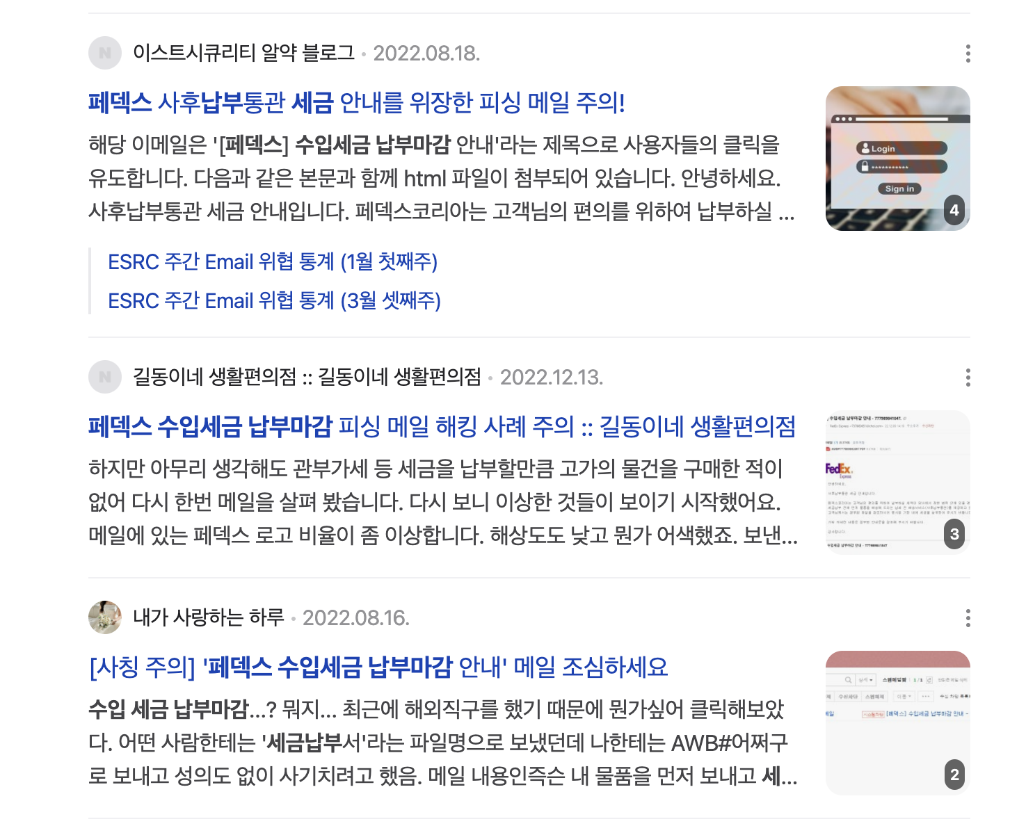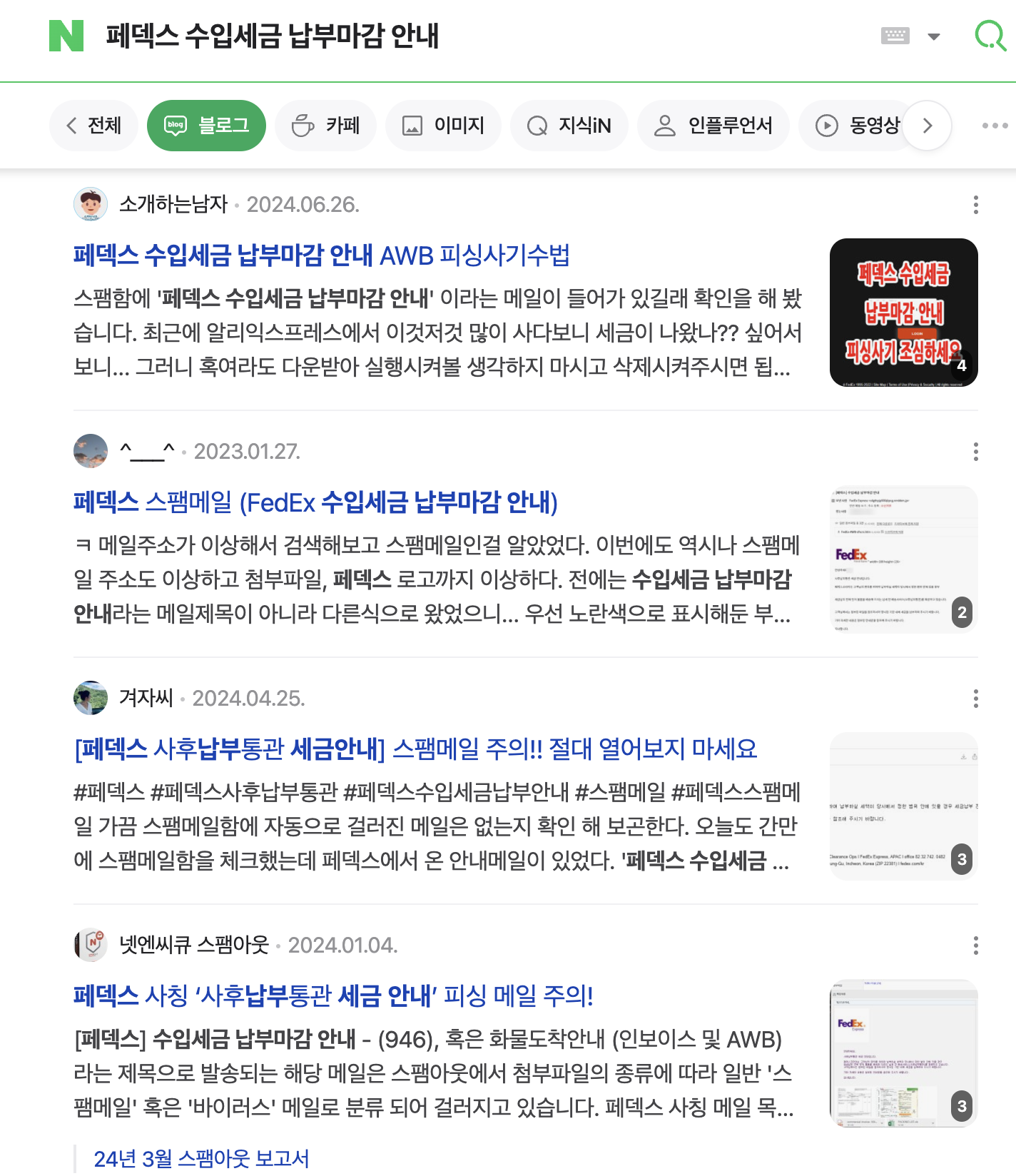 메일 제목 그대로 '페덱스 수입세금 납부마감 안내' 그대로 검색해 봤는데, 뭐 당연하게도 상당히 많은 분들의 피싱 관련 주의 포스팅이 나왔다. 21년도부터 24년도 비교적 최근까지 포스팅들이 있는 걸 보면 좀 유래가 깊은 피싱 수법이라는 것을 알게 되었다.