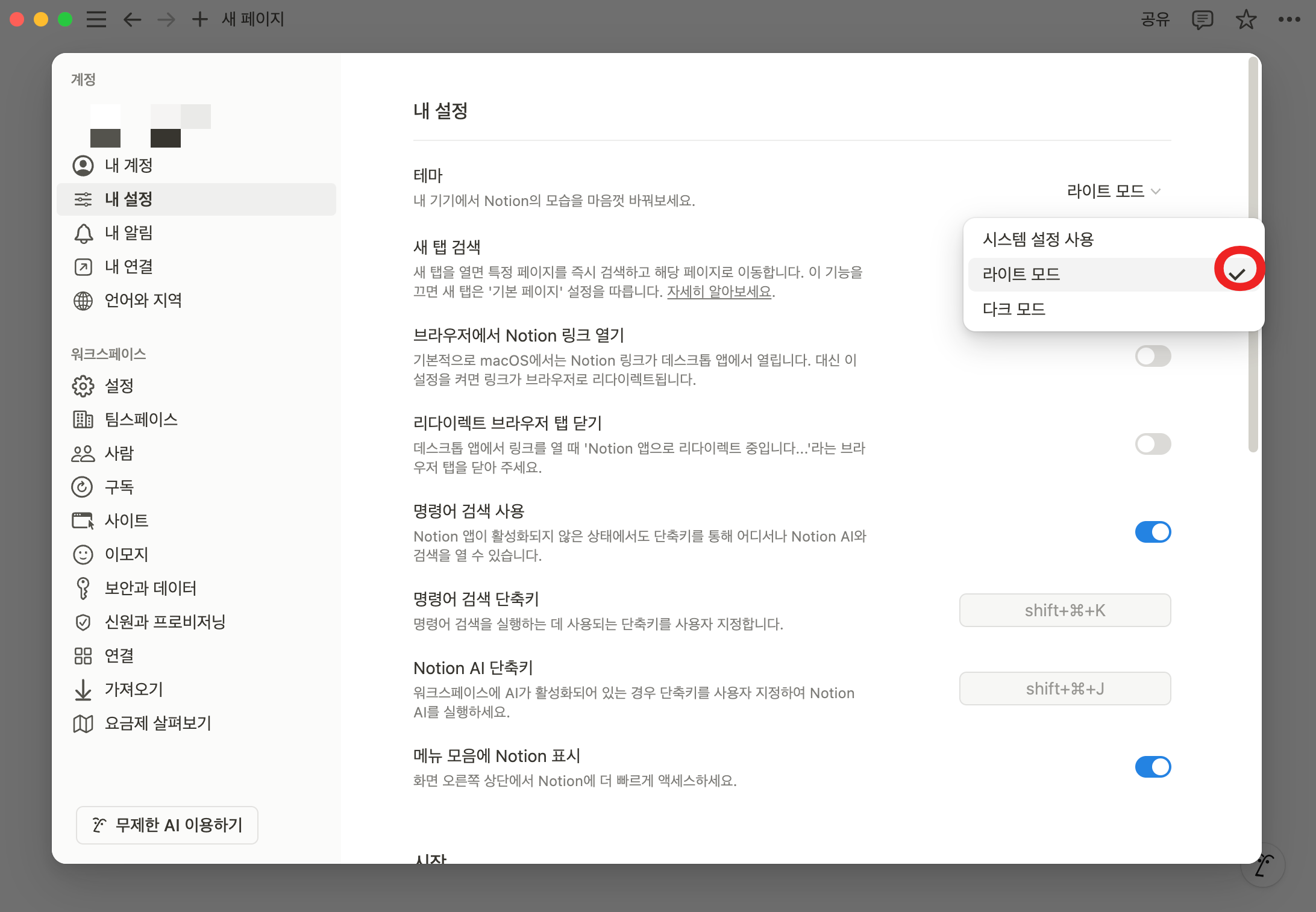 *시스템 설정 사용 시, 자신이 사용 중인 PC나 스마트폰의 설정에 맞춰 라이트나 다크 모드로 변경된다.