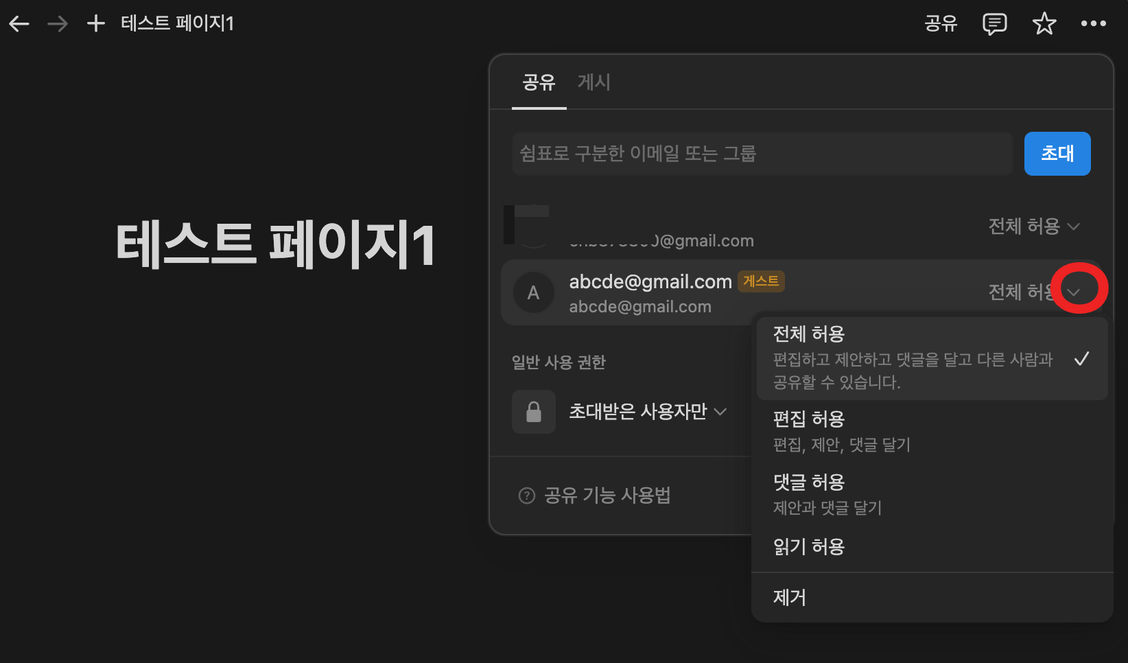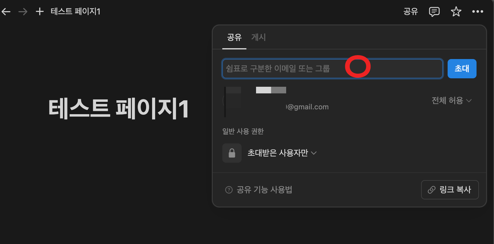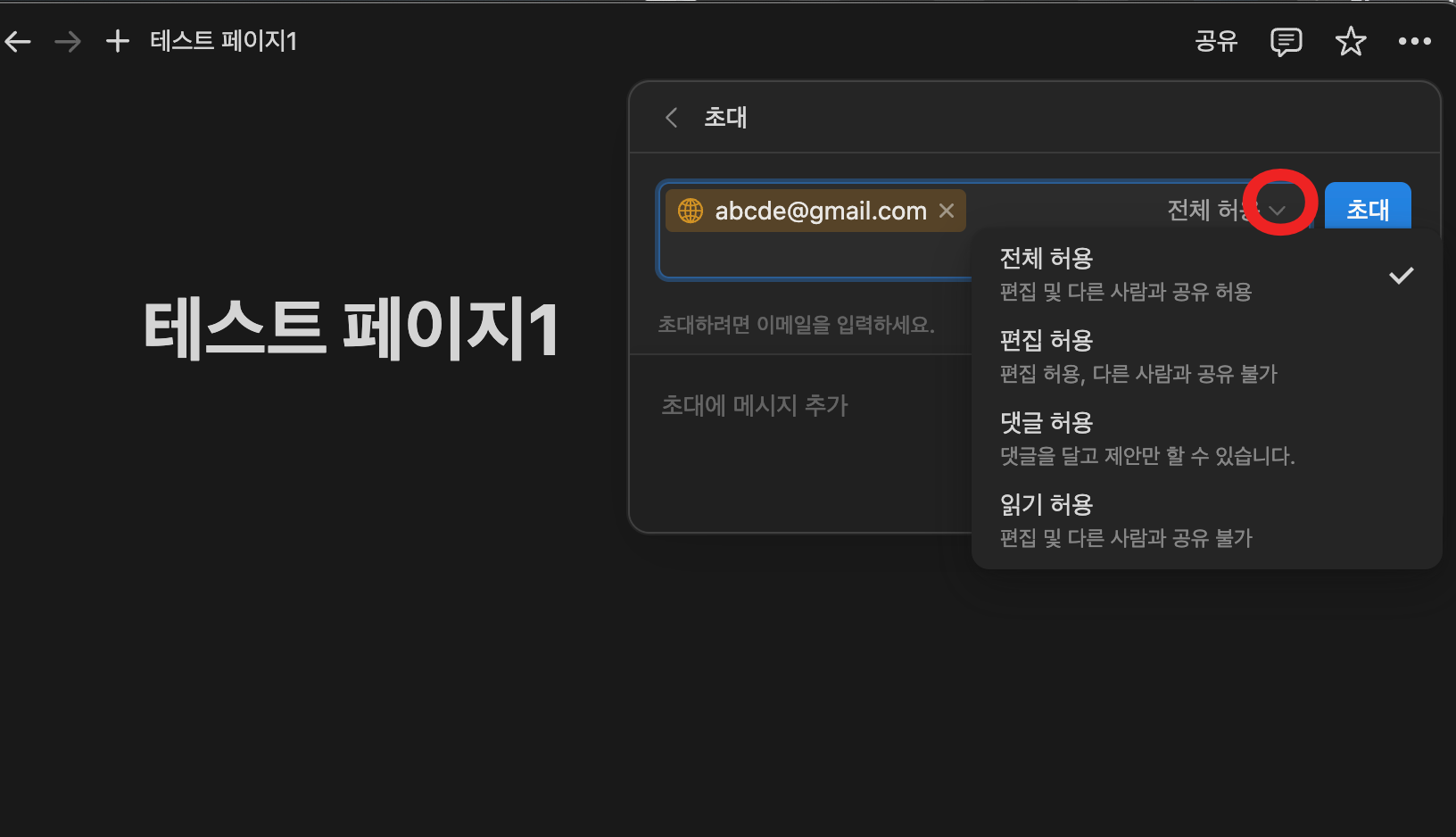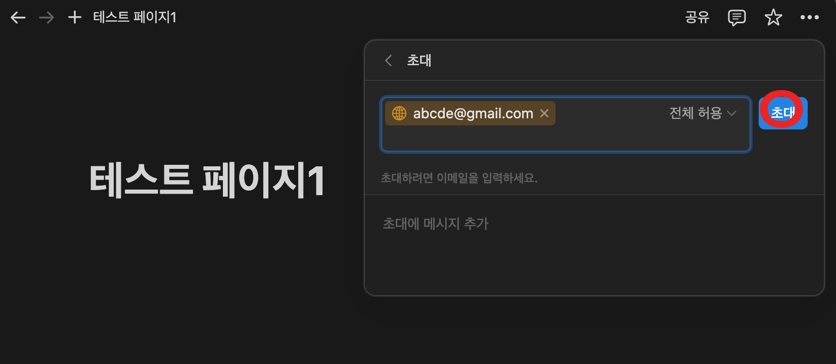 1) 노션 워크스페이스 페이지 우측 상단 '공유' > 초대할 메일 주소 입력 > 주소입력 후 우측 권한 설정