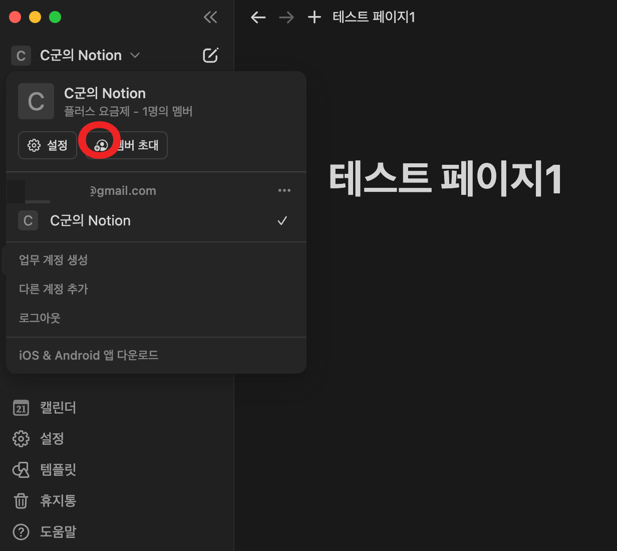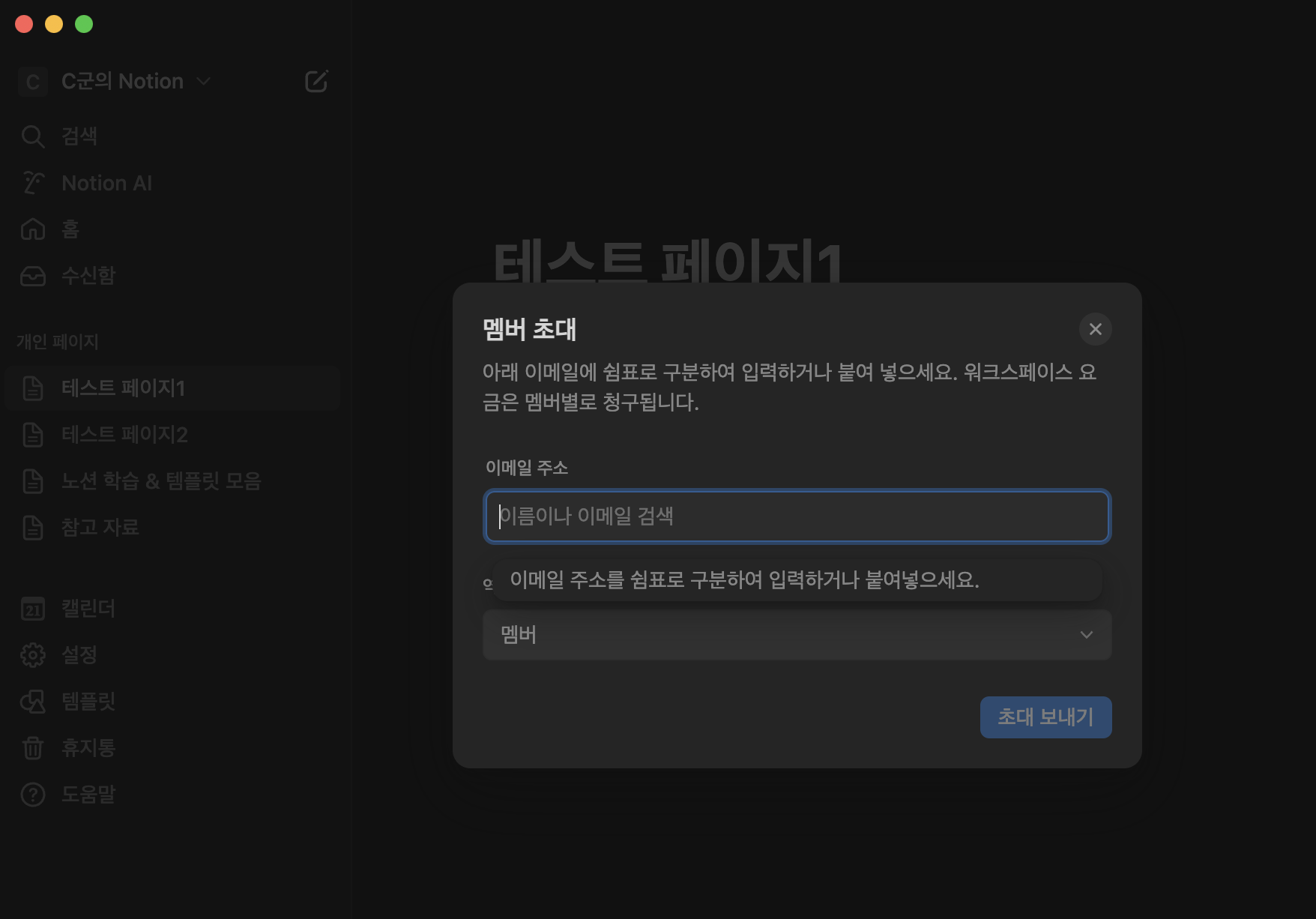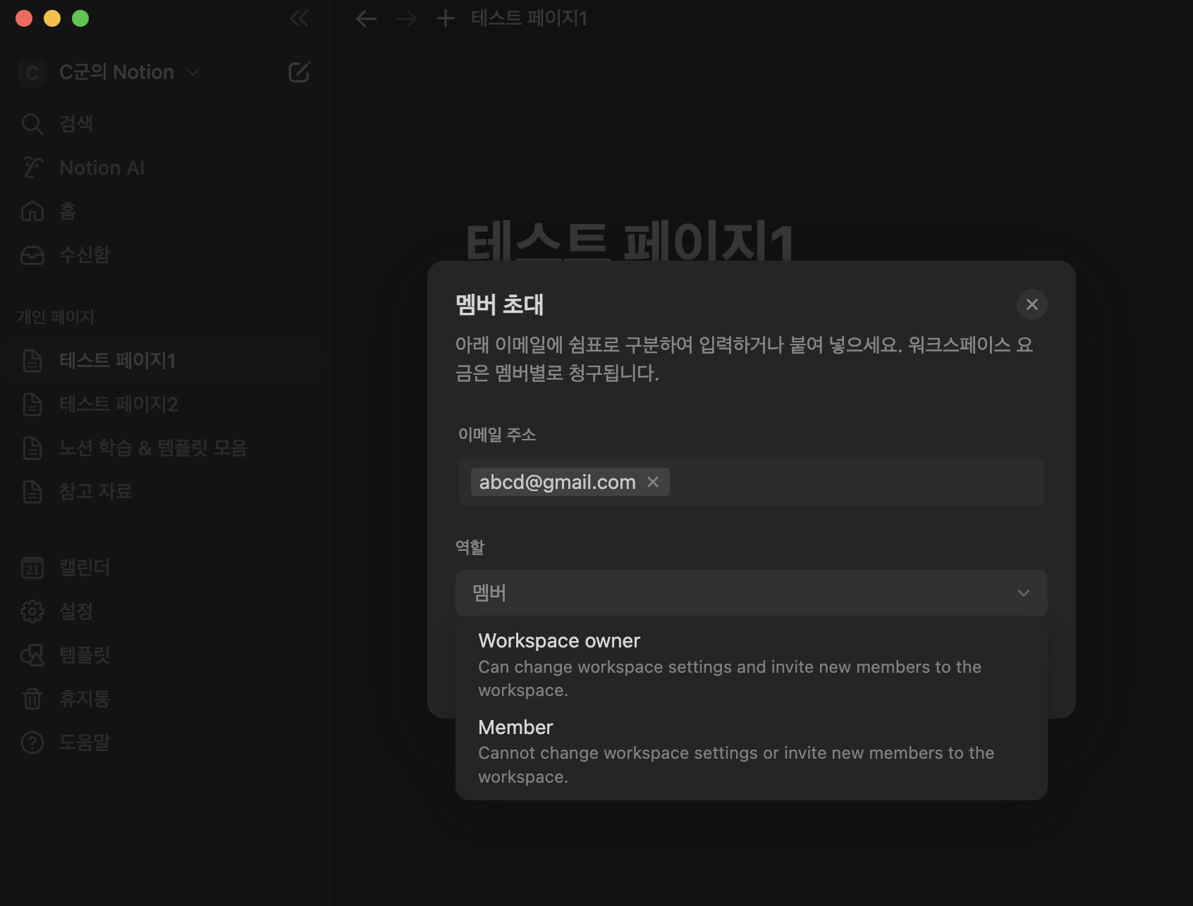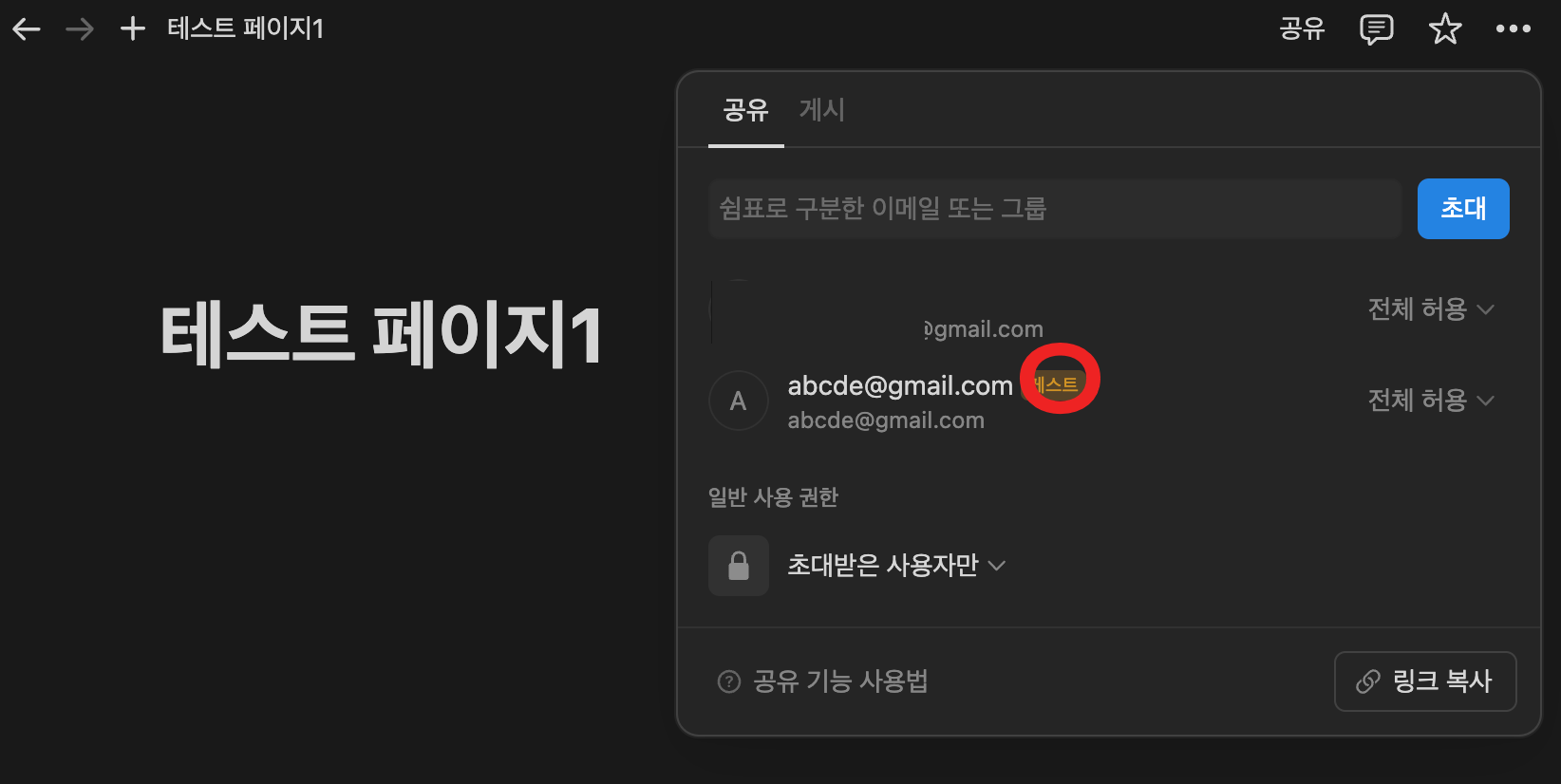 1) 노션 워크스페이스 페이지 우측 상단 '공유' > 초대할 메일 주소 입력 > 주소입력 후 우측 권한 설정