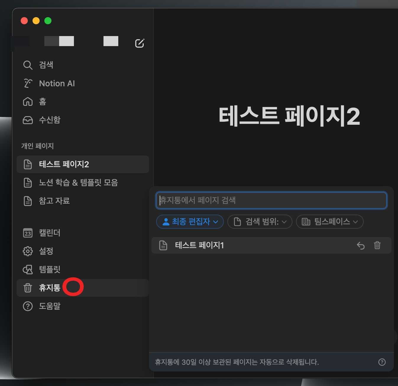 *휴지통에서 삭제한 페이지 명이나 다양한 필터로 페이지를 찾을 수 있음
