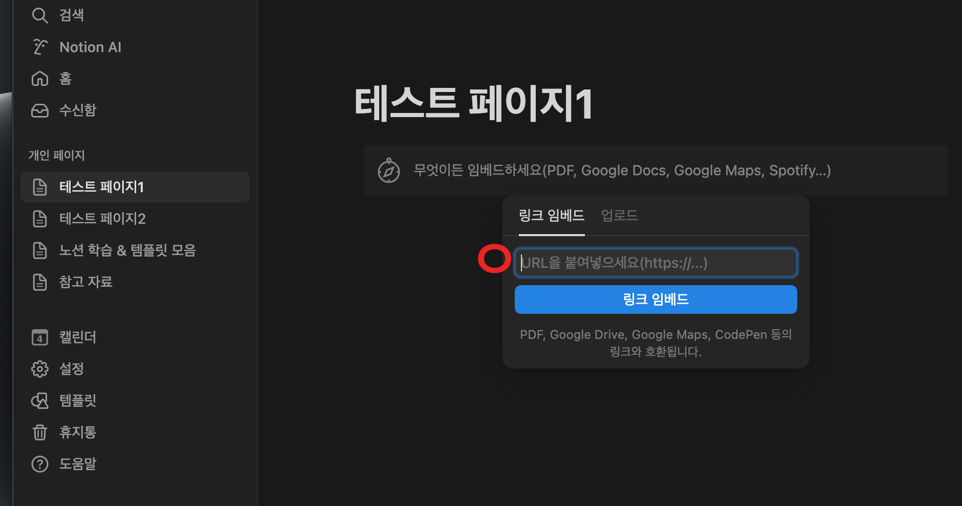 1) 기본페이지 생성 → 페이지 내 '+' 선택 → 메뉴 중 '임베드' 선택