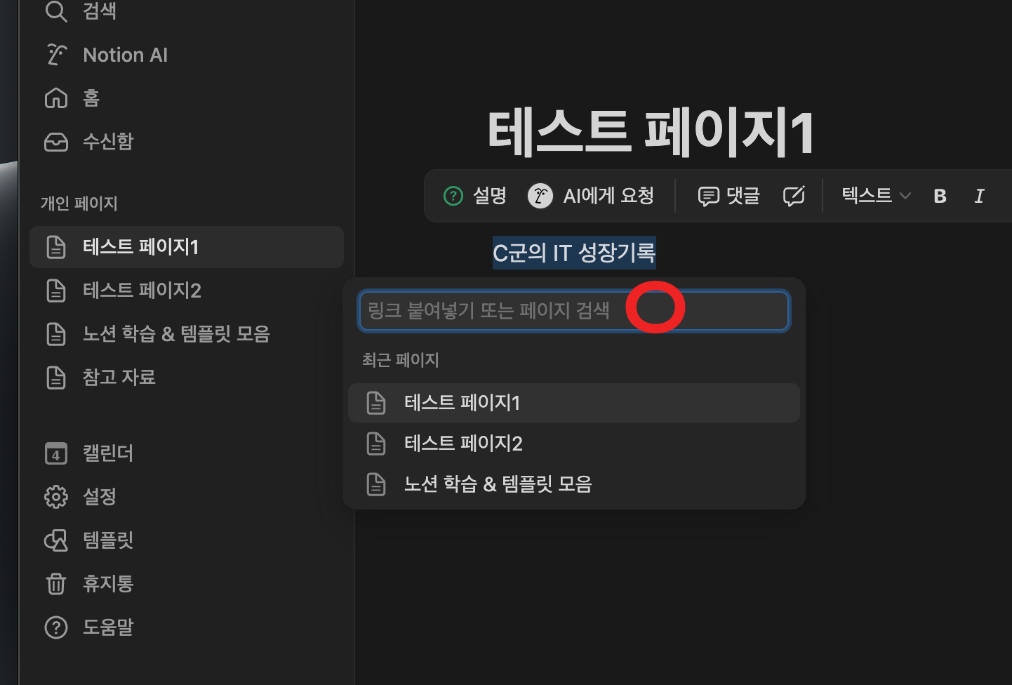 1) 기본페이지 생성 → 페이지 내 링크를 생성할 텍스트 입력 → 텍스트 드래그 후 우클릭