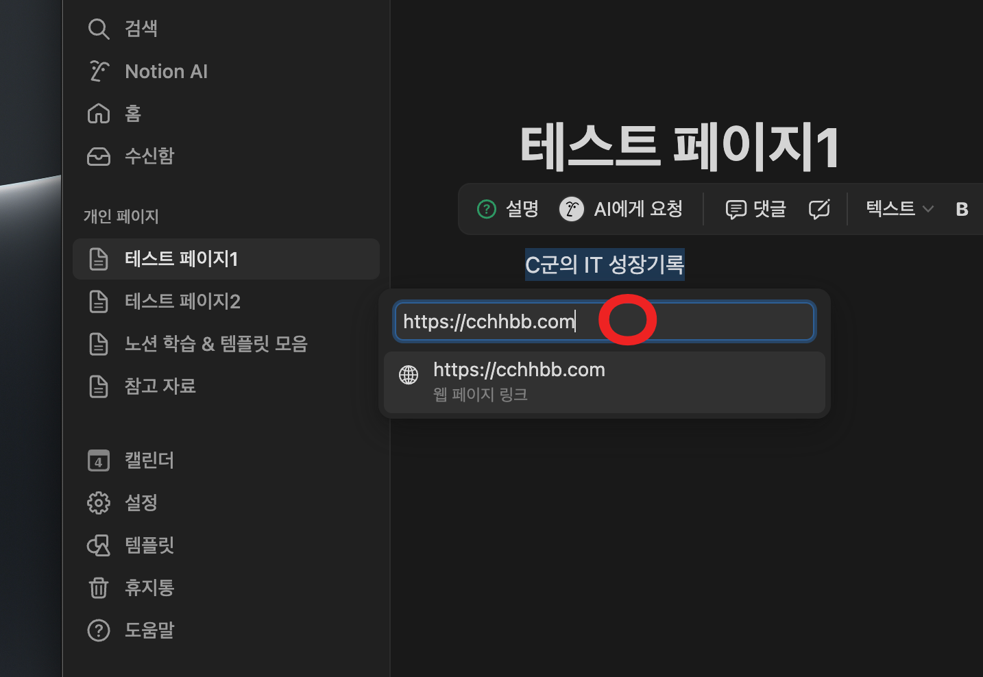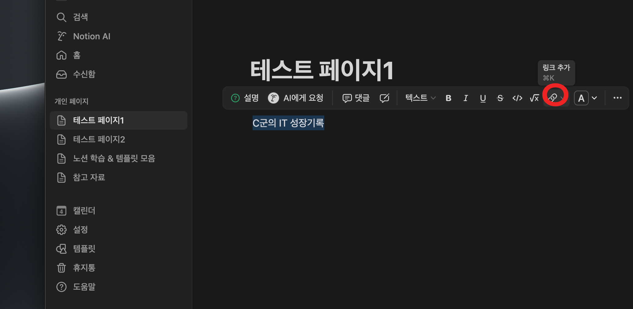 1) 기본페이지 생성 → 페이지 내 링크를 생성할 텍스트 입력 → 텍스트 드래그 후 우클릭