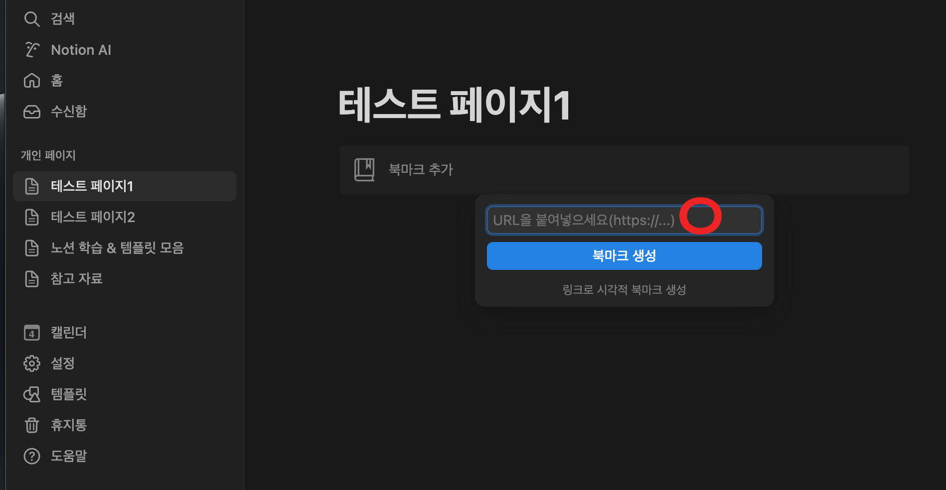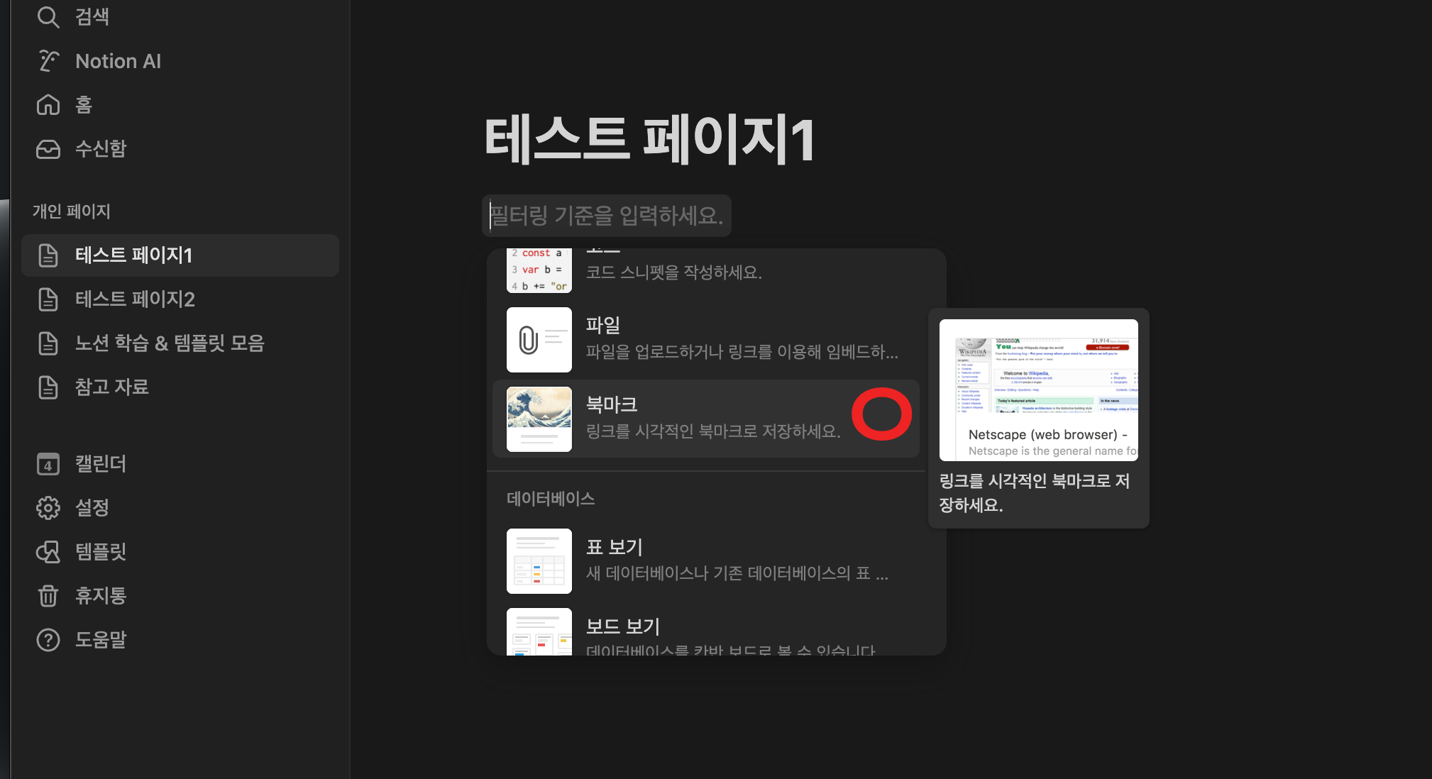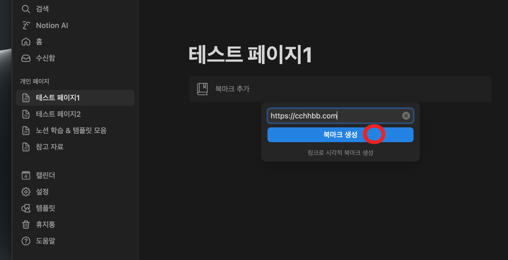 1) 기본페이지 생성 → 페이지내 '+' 선택 → 메뉴중 '북마크' 선택