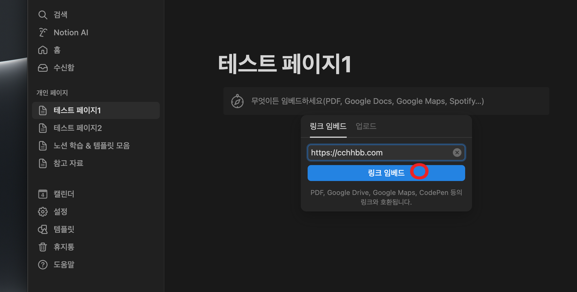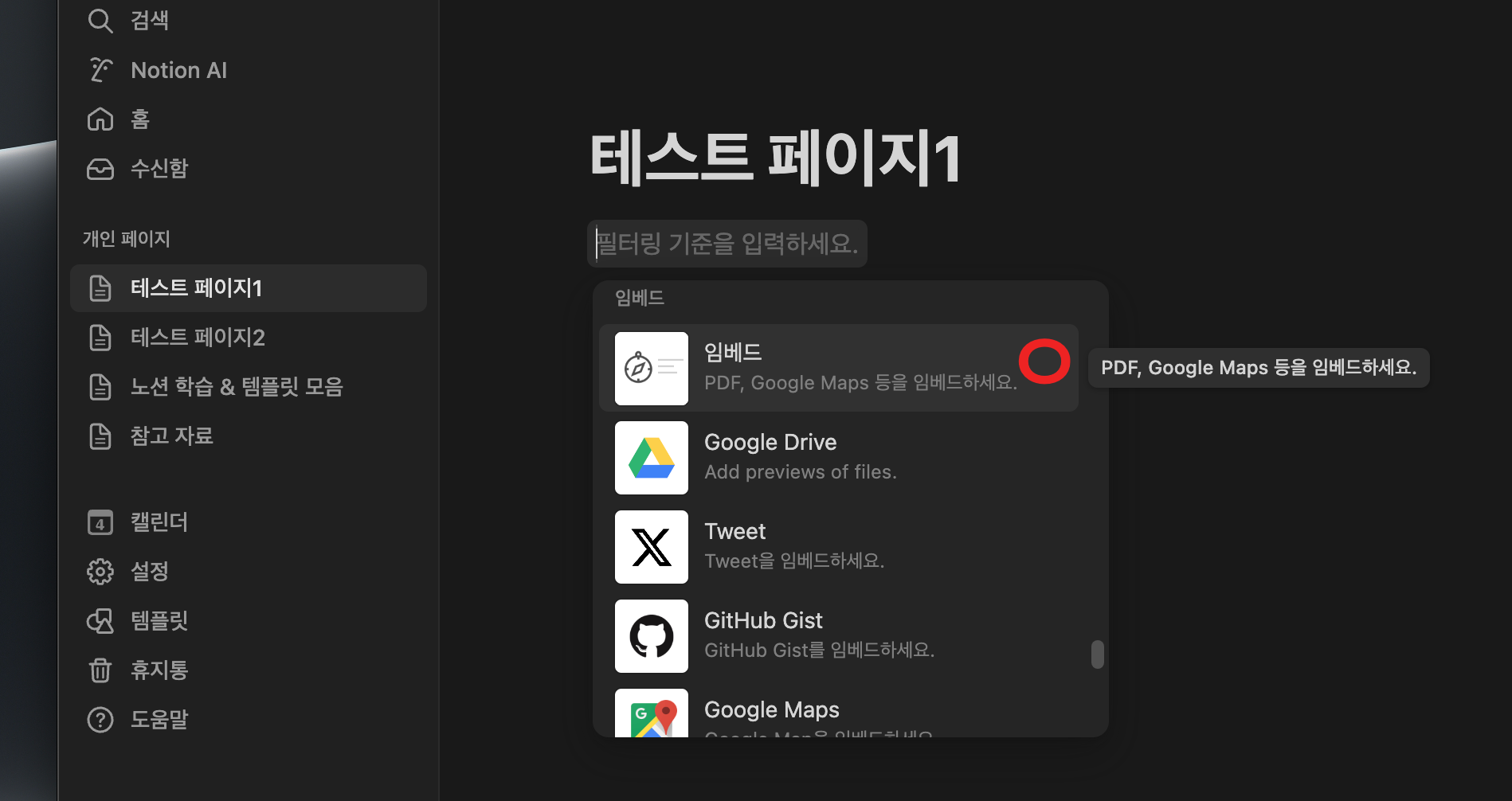 1) 기본페이지 생성 → 페이지 내 '+' 선택 → 메뉴 중 '임베드' 선택